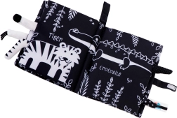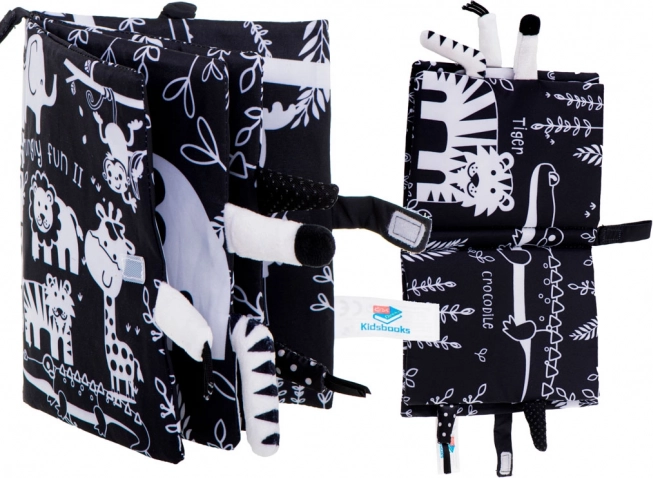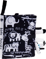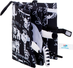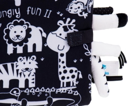 Este suave libro sensorial es el compañero ideal para bebés desde 0+. Las ilustraciones en blanco y negro de alto contraste de animales del safari (jirafa, león, elefante, monito, tigrecito, cocodrilo) atraen la atención y apoyan el correcto desarrollo de la vista en los primeros meses. Las colitas suaves sobresalientes invitan al tacto y entrenan el agarre.