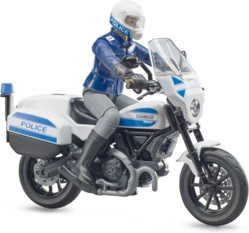 La moto policial DUCATI Scrambler de Bruder es un modelo detallado para pequeños y grandes aficionados a los servicios de emergencia. La motocicleta tiene manillar giratorio para maniobrar con facilidad y caballete abatible para un estacionamiento estable. La figura del policía tiene extremidades móviles, por lo que puede colocarse en posición de conducción o de pie junto a la máquina.