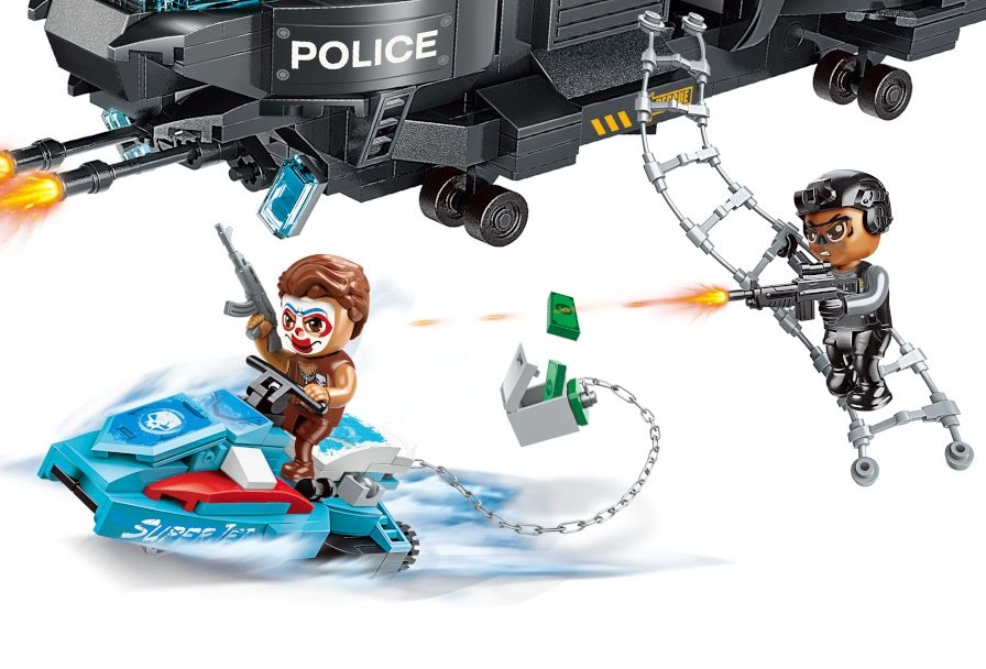 Entra en el mundo de las misiones de acción con una unidad policial que no da tregua a los delincuentes. El helicóptero con rotores funcionales y una escalera de cuerda desplegable permite un desembarco relámpago en el corazón de la acción, mientras el perseguido huye en un vehículo transformable: de moto a moto acuática en cuestión de segundos.