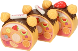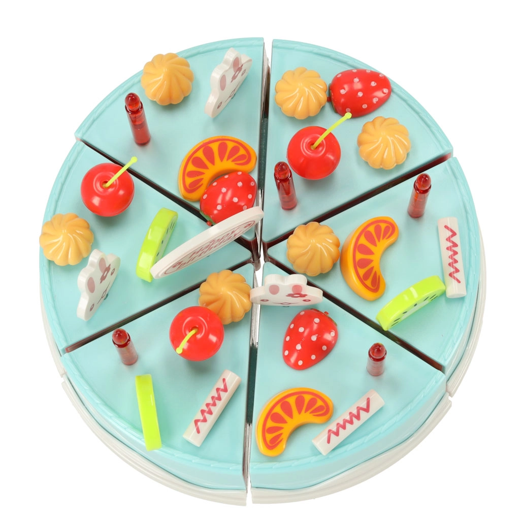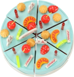 Seis porciones de tarta unidas con velcro: los niños las cortan fácilmente con el cuchillo de plástico y las vuelven a colocar. Ideal para entrenar la motricidad fina y el juego realista.
