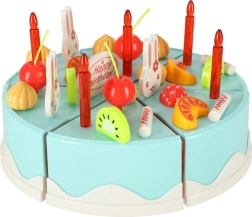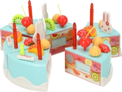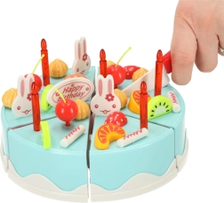 Este colorido set con tarta de cumpleaños azul es ideal para juegos de fiesta y cocina infantil. La tarta se compone de 6 porciones unidas con velcro, de modo que los niños pueden cortarla con el cuchillo de plástico incluido, reorganizarla y volver a decorarla. Los abundantes accesorios —desde velas y fruta hasta adorables conejitos y el letrero “Happy Birthday”— estimulan la creatividad y el desarrollo de la imaginación.