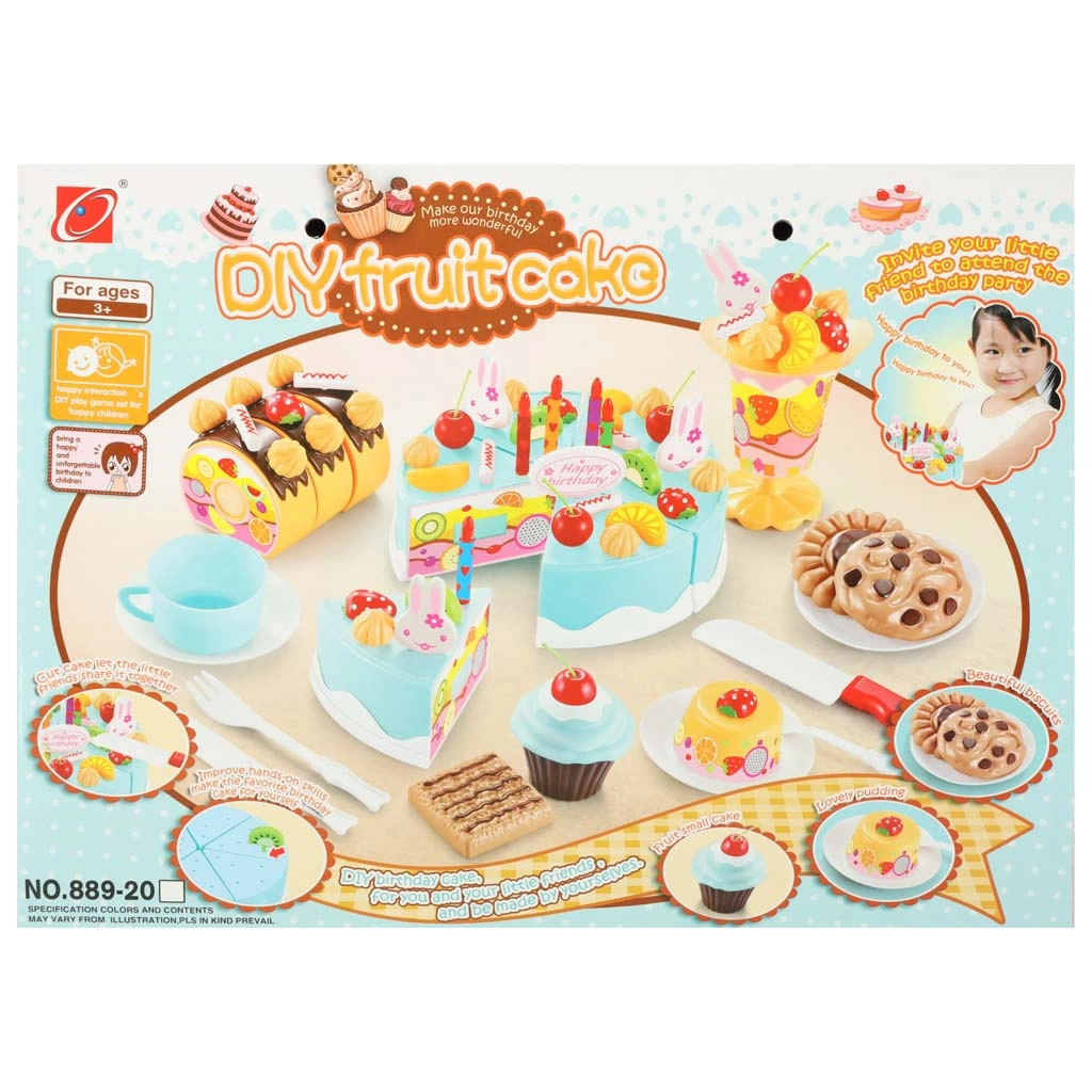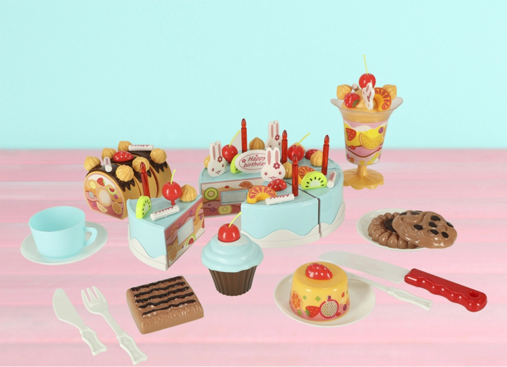 - Contenido del set (75 piezas): 6× porción de tarta, 5× vela, 14× merengue, 7× bastón de caramelo, 4× cereza, 4× mandarina, 3× fresa, 3× kiwi, 4× conejito, 1× letrero, 3× platito, 3× galleta, 3× porción de brazo de gitano, 3× cupcake, 1× taza, 1× cucharita, 1× tenedor, 1× cuchillito, 1× pala para tarta, 1× copa para helado, set de pegatinas, set de velcros.