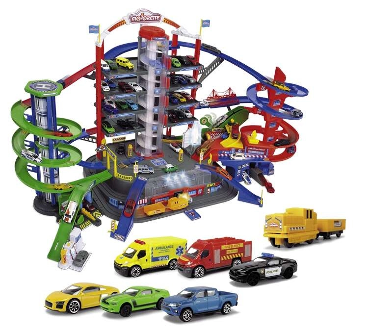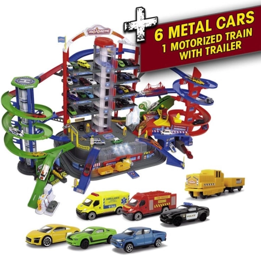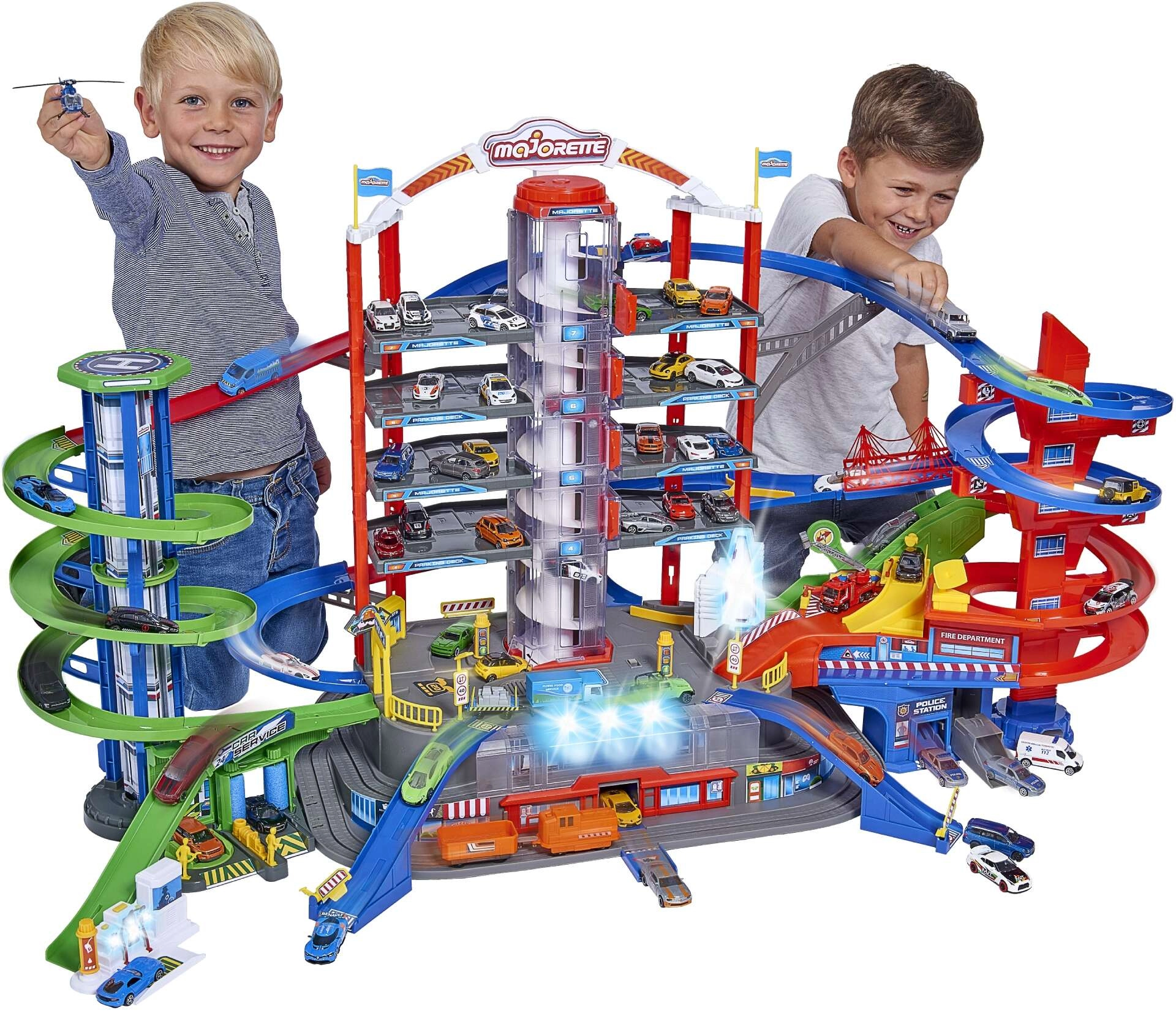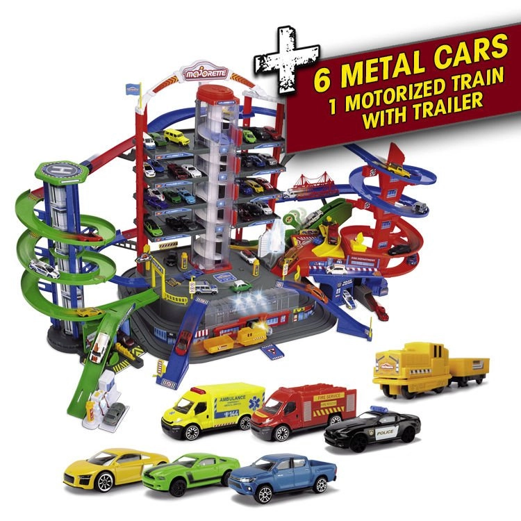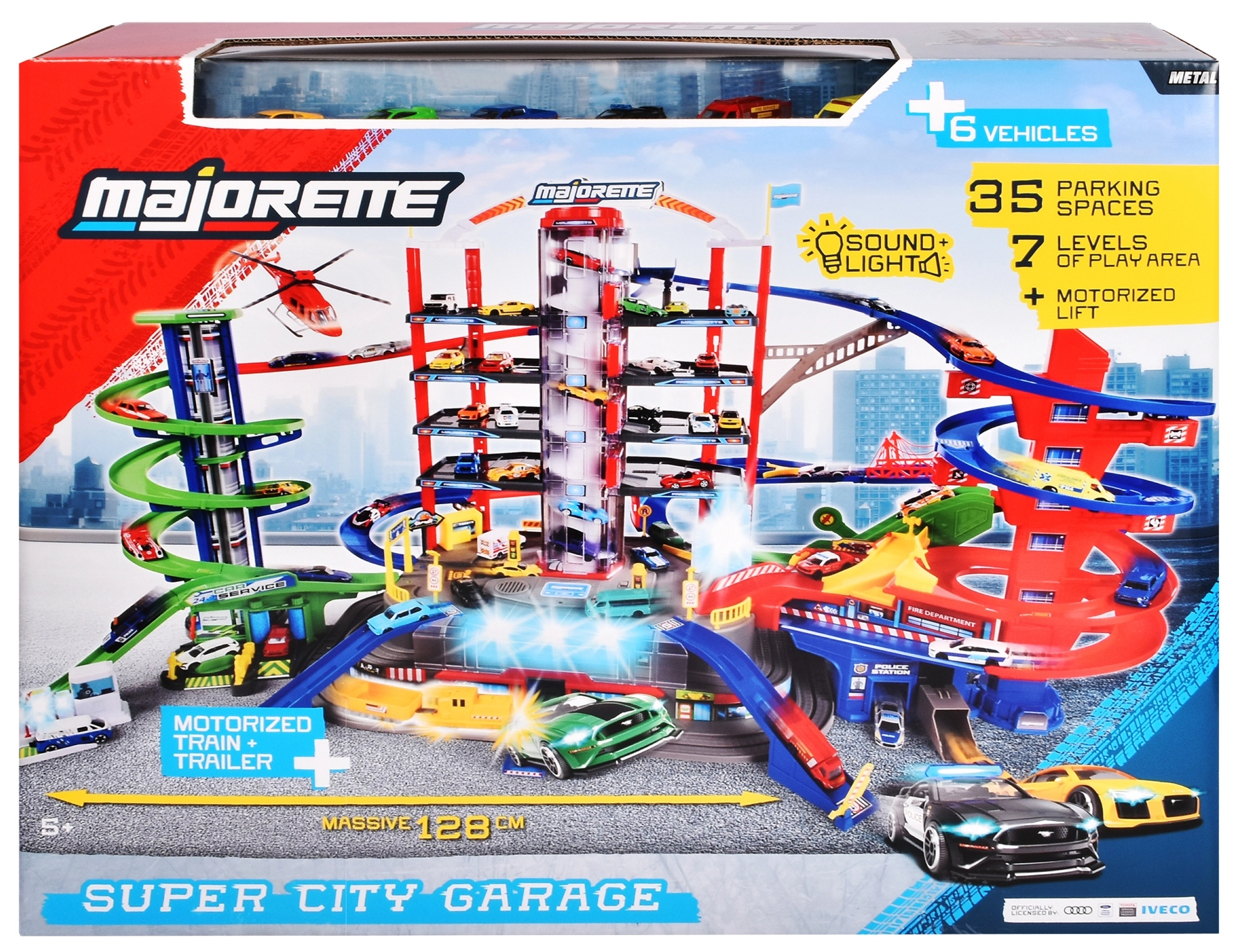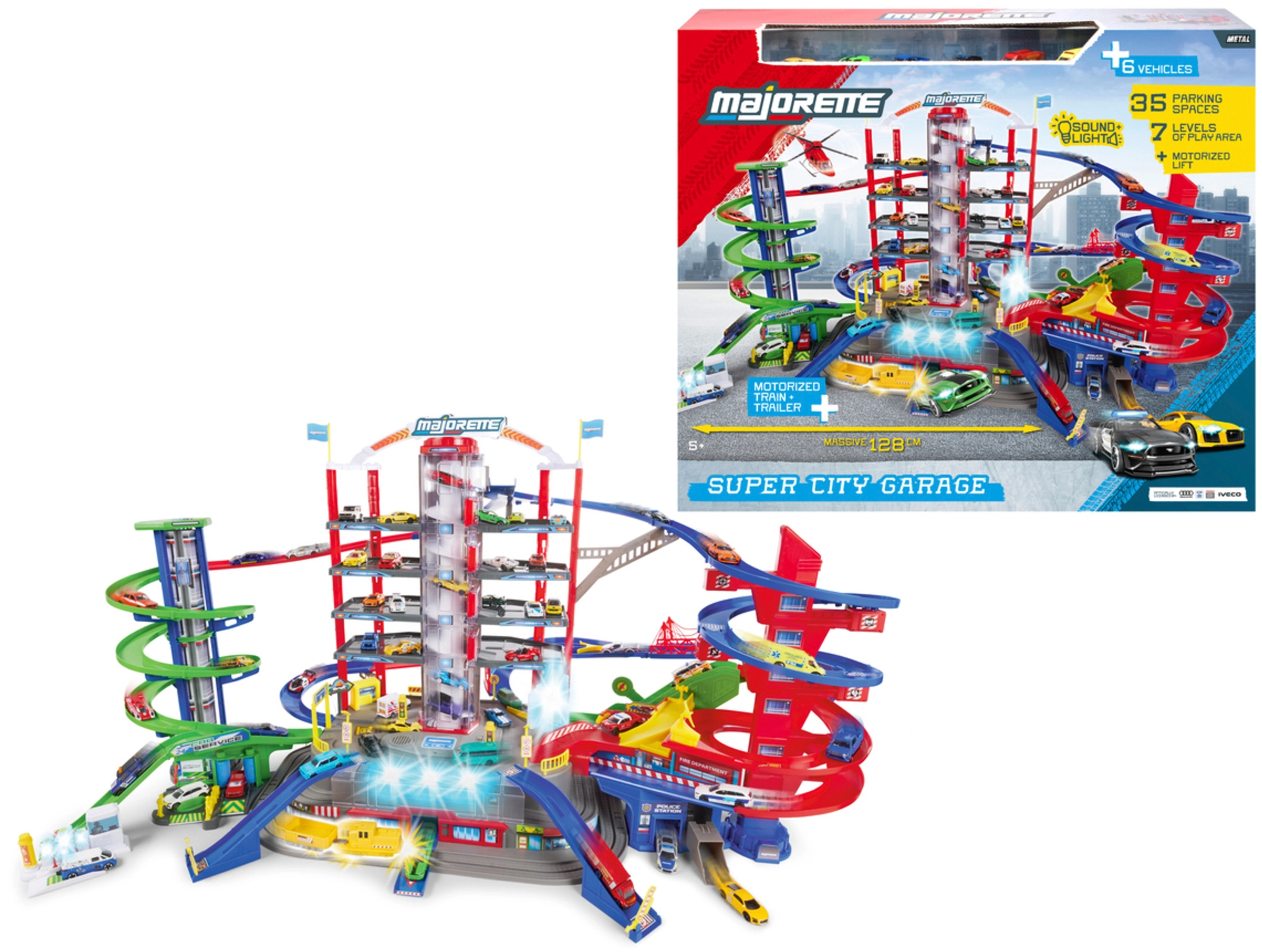 Descubre el mega set para pequeños conductores: complejo de garaje Super City de 7 pisos con ascensor, rampas en espiral y 6 cochecitos de metal complementados con una locomotora con efectos de luz y sonido. No faltan heliopuerto, estación de policía y bomberos, lavadero ni gasolinera con luces y sonidos: todo para la máxima dosis de juego de acción y creatividad.