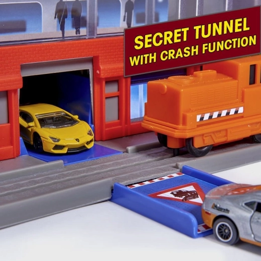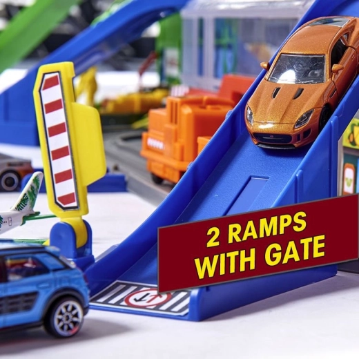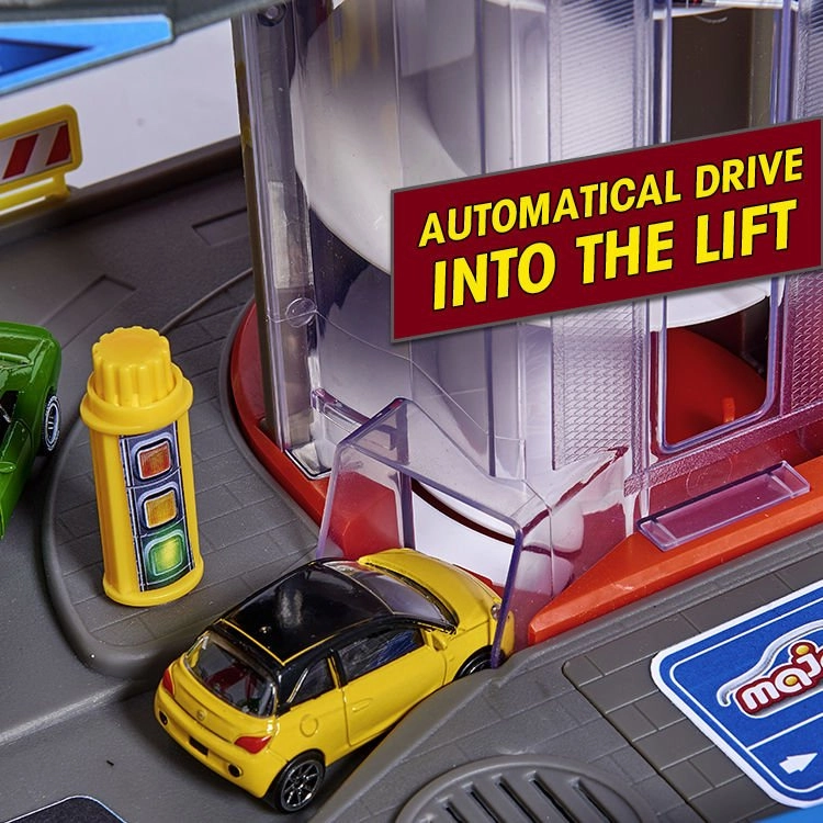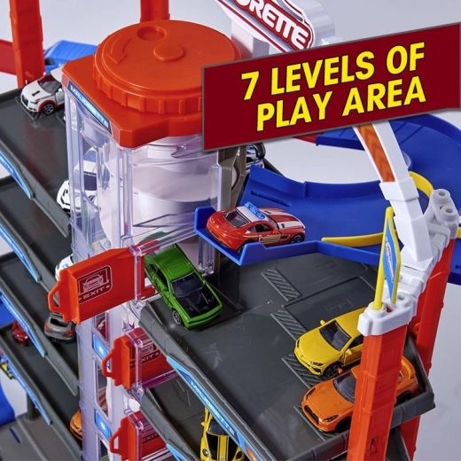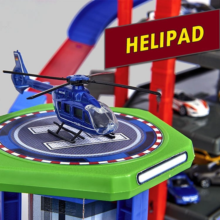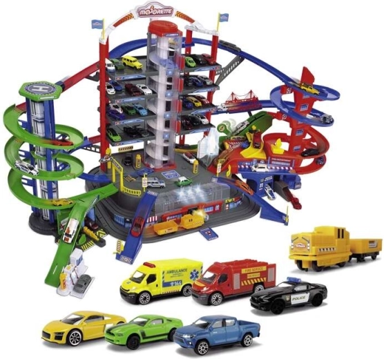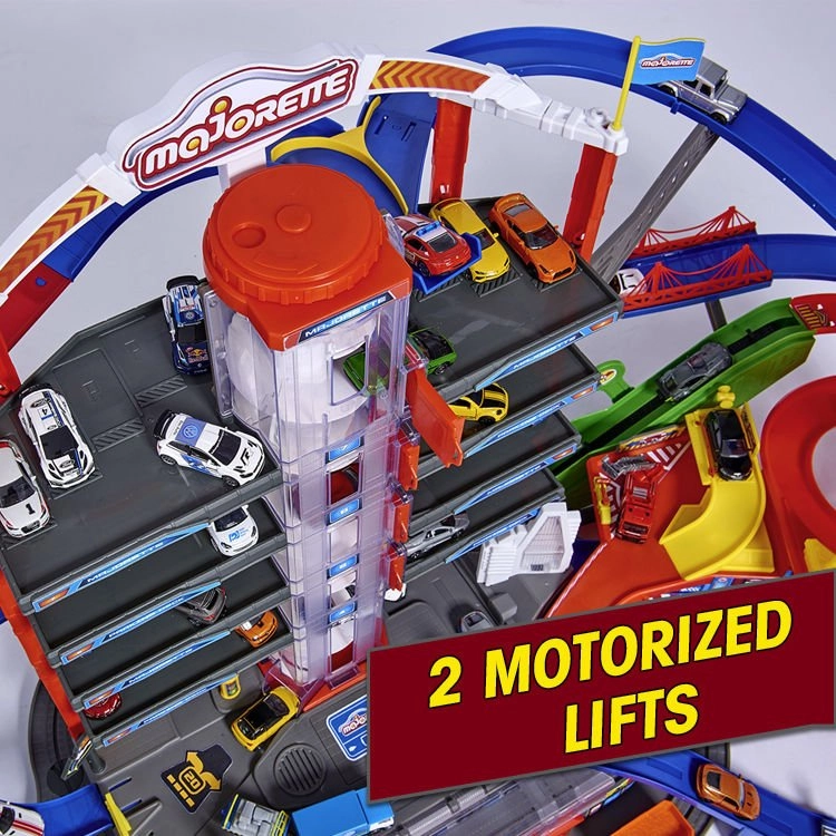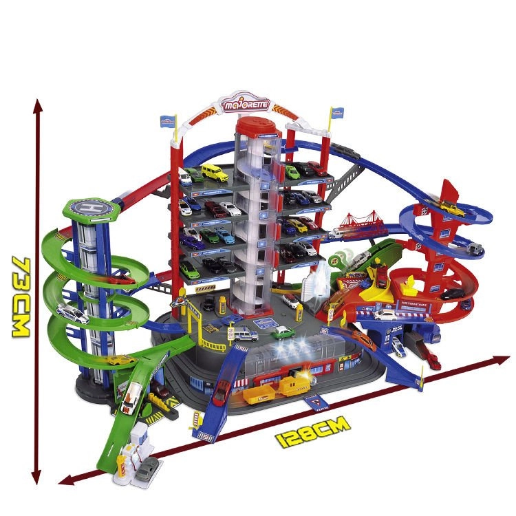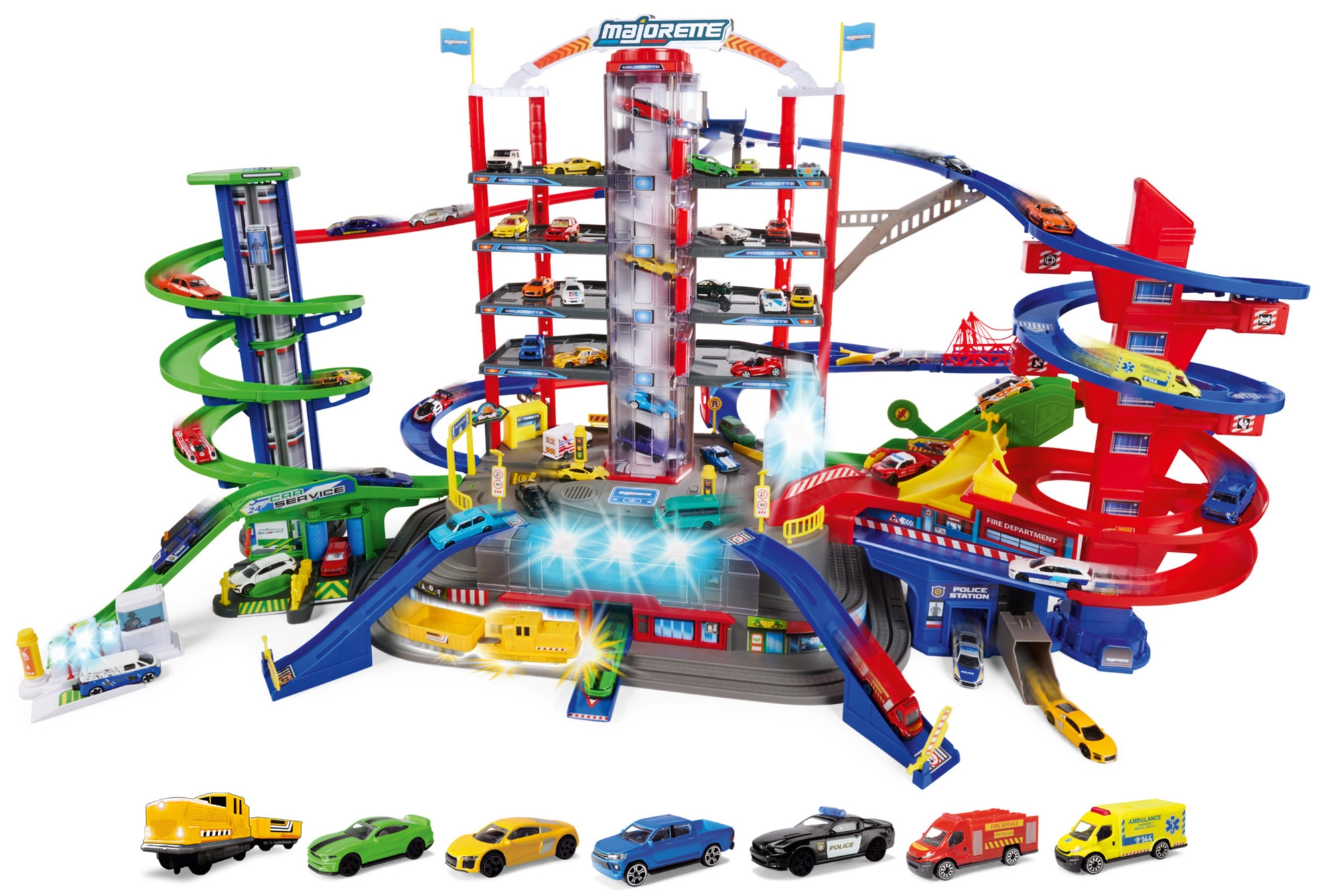 Descubre el mega set para pequeños conductores: complejo de garaje Super City de 7 pisos con ascensor, rampas en espiral y 6 cochecitos de metal complementados con una locomotora con efectos de luz y sonido. No faltan heliopuerto, estación de policía y bomberos, lavadero ni gasolinera con luces y sonidos: todo para la máxima dosis de juego de acción y creatividad.