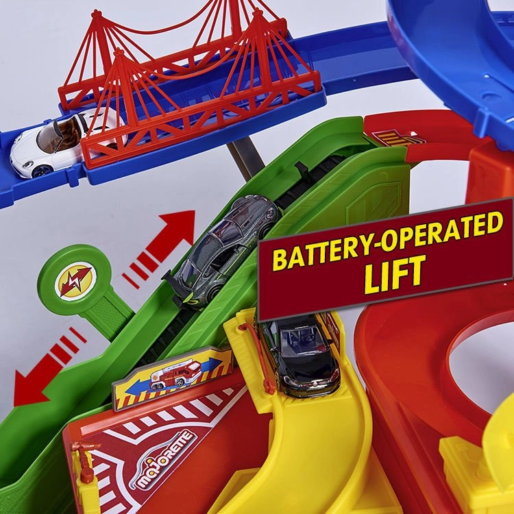 Este gran set de garaje ofrece a los niños infinitas posibilidades de juego en siete pisos. Las pistas en espiral de colores, el ascensor con alimentación por pilas y los efectos de luz y sonido realistas cautivarán a cualquier pequeño fan de los coches y trenes. Los cochecitos de metal con ruedas de giro libre circulan suavemente por las rampas, mientras que la locomotora con vagón atraviesa un túnel secreto y se detiene en la estación de tren.