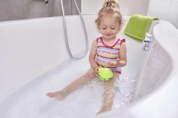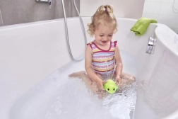 Gracias a su longitud compacta de 11 cm, se sostiene fácilmente incluso en las manos más pequeñas. El plástico resistente y liso se limpia con facilidad y está diseñado para el uso diario en la bañera o en la piscinita infantil.
