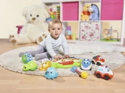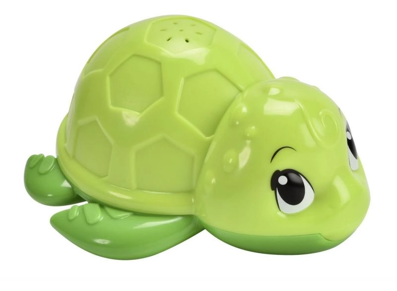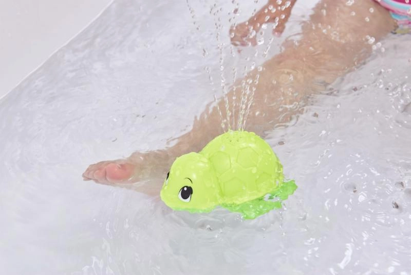La tortuguita se desliza por la superficie y rocía suavemente agua, ideal para baños divertidos y primeros juegos acuáticos.
