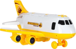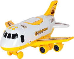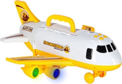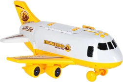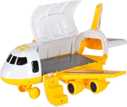 Gran avión de transporte para niños que lleva a bordo tres máquinas de construcción y un set de señales de tráfico. Ofrece rampa abatible, acceso lateral, efectos LED luminosos y sonidos reales controlados por cuatro botones. Gracias a las alas desmontables y al práctico asa, se transporta y almacena fácilmente.