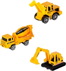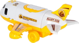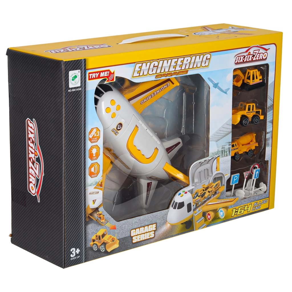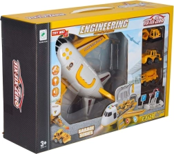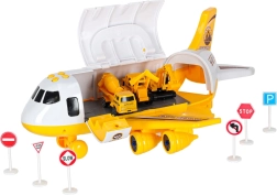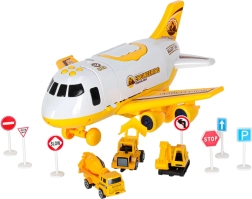 Incluye tres vehículos de construcción amarillos: excavadora con brazo móvil, hormigonera y bulldozer, además de 7 señales de tráfico. Todo cabe dentro del avión. El juguete tiene alas desmontables para ahorrar espacio y un asa para facilitar el transporte.