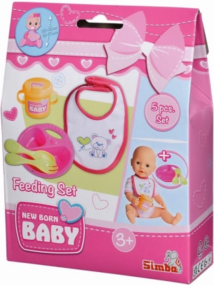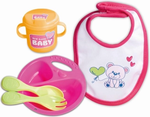 Adorable juego de comedor para muñecas NEW BORN BABY que incluye 5 piezas: plato, cucharita, tenedor, tacita y babero, para muñecas de 30–43 cm. Un set ligero y fácil de limpiar, ideal para juegos de alimentación y el desarrollo de la motricidad fina.