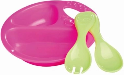 Vajilla de plástico ligera con formas redondeadas y cubiertos ergonómicos que fomentan el juego autónomo y la motricidad fina.