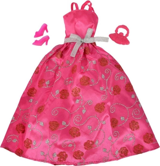 El vestido incluye tacones a juego y un bolso que complementan este conjunto elegante para muñecas.