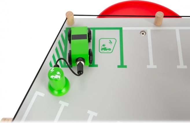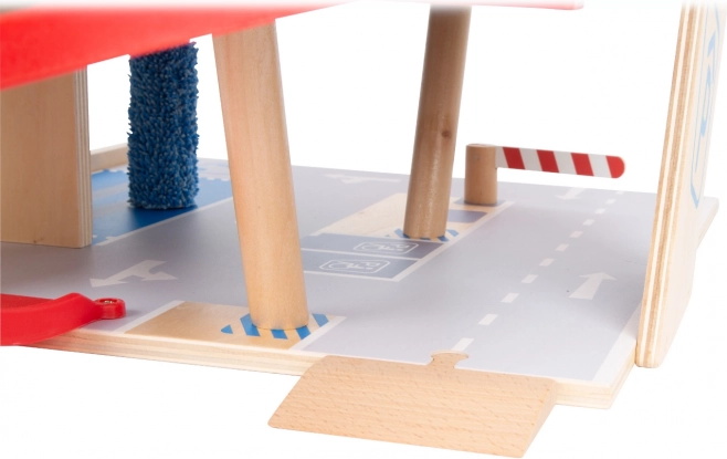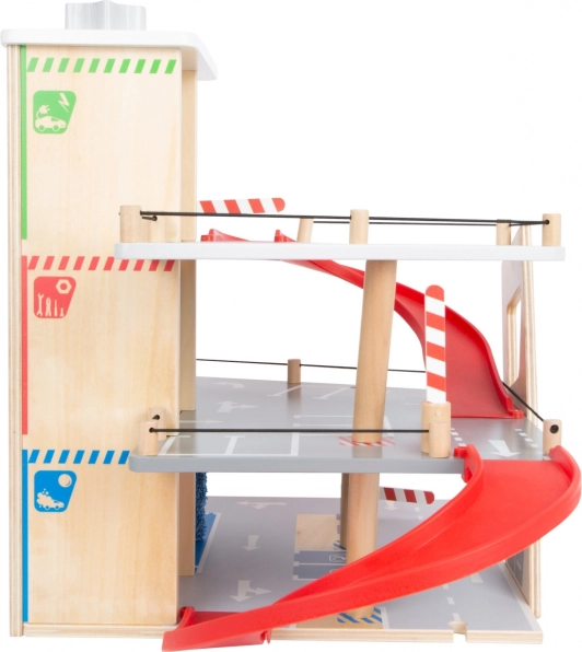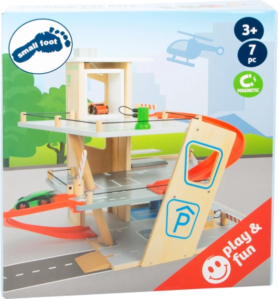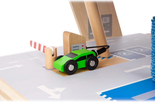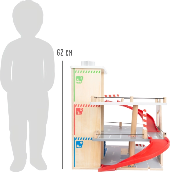 Descubra un robusto aparcamiento de madera con tres plantas, ascensor funcional y rampas fluidas para juegos interminables con coches. Incluye dos coches, estación de servicio, cargador para coches eléctricos, plataforma elevadora, lavadero de coches con cepillos y barreras mecánicas en cada planta. La conducción segura está garantizada por el vallado de goma y la señalización detallada fomenta la educación vial.