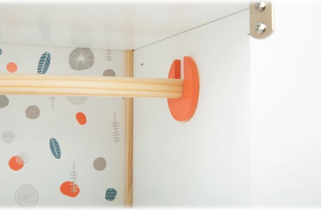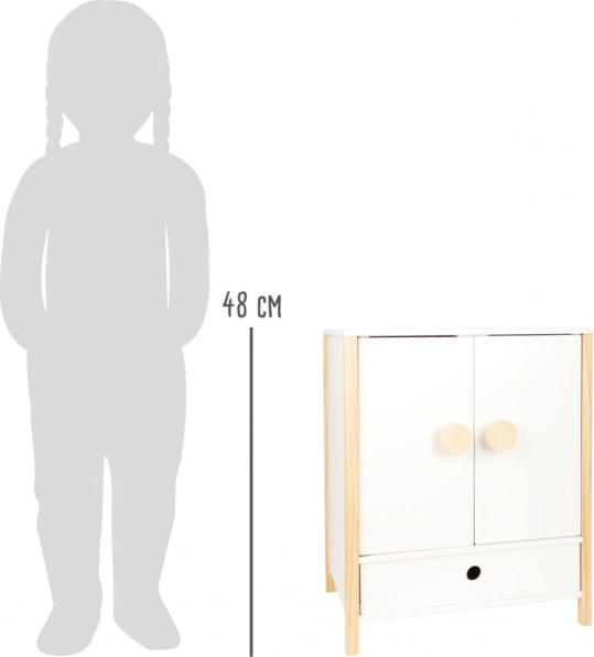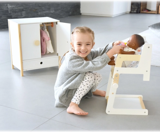 La estructura de madera resistente, el acabado estable y los bordes redondeados garantizan un juego cómodo y seguro. El armario fomenta la autonomía, el sentido del orden y desarrolla la imaginación durante el juego de cuidado de las muñecas.