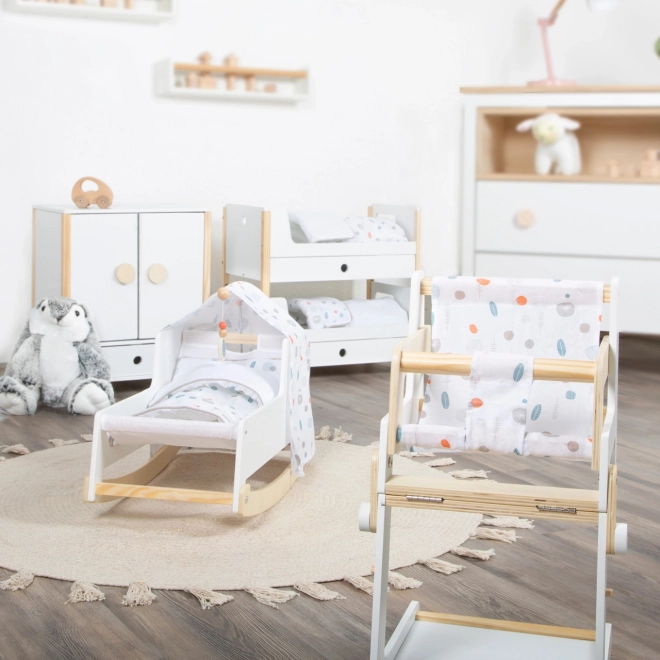 Este elegante armario para muñecas de la línea Little Button combina líneas limpias, materiales naturales y una distribución interior funcional. Los niños lo tienen todo a mano: una barra con perchas para colgar vestidos, estantes extraíbles para accesorios y un espacioso cajón para pequeños objetos. Su diseño minimalista en tonos suaves se integra de forma natural en interiores modernos.