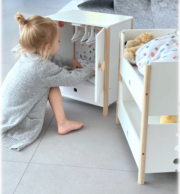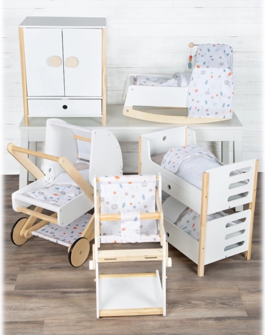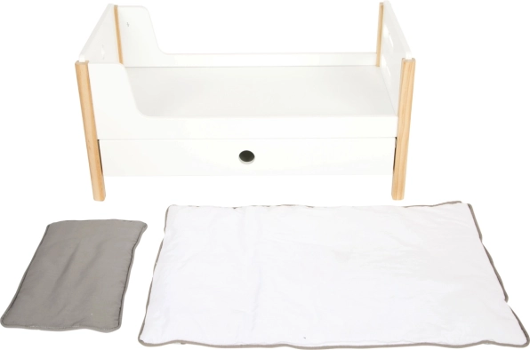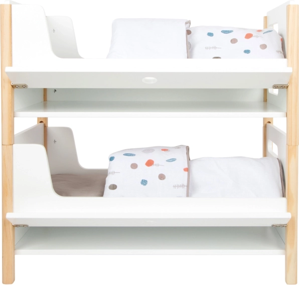 El paquete incluye ropa de cama en colores neutros y edredones de gran tamaño, que alojan cómodamente muñecas o peluches de hasta 46 cm. Los cajones debajo de cada cama ofrecen un almacenamiento inteligente para ropita y pequeños accesorios. Un complemento ideal para el dormitorio infantil y para un rincón de muñecas con estilo dentro de la colección Little Button.