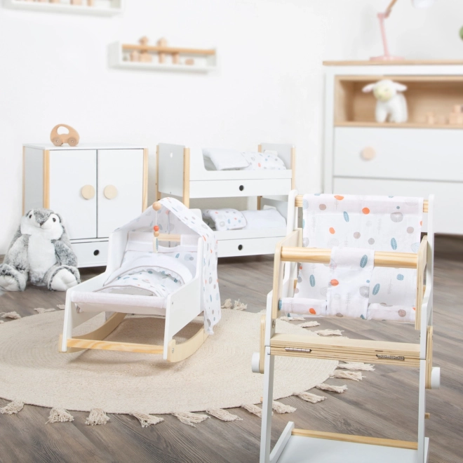 Los cajones bajo las camas mantienen en orden los accesorios, mientras que la ropa de cama de género neutro y los edredones de gran tamaño se ajustan a muñecas de hasta 46 cm.
