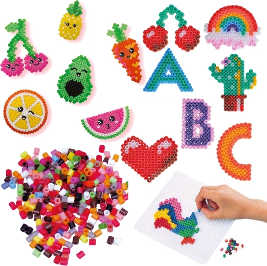 El set fomenta la creatividad, la coordinación ojo–mano y refuerza en los niños la motricidad fina. Crea letras, corazones, frutas, animales o arcoíris; los motivos terminados se pueden usar como llaveros, decoraciones para la habitación o regalos.