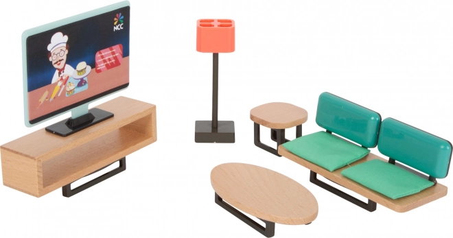 Un sofá con estilo, una mesa y una TV crean el acogedor centro de la casita. Ideal para contar historias y desarrollar la imaginación.