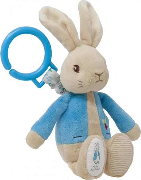 El conejito de cuerda PETER RABBIT, con su icónica chaquetita azul, está diseñado para las manos más pequeñas. Gracias al anillo de plástico, se fija fácilmente al cochecito, a la silla de coche o sobre la cuna. El niño agarra el juguete y tira de él; al soltarlo, el conejito vuelve suavemente, lo que favorece el desarrollo de la motricidad fina, la coordinación ojo-mano y la percepción sensorial.