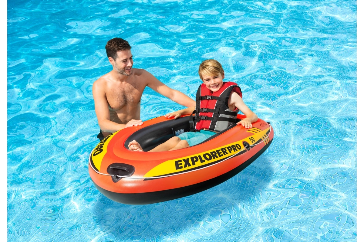 Brinda diversión a los niños en el agua con la barca inflable EXPLORER PRO 50. Gracias a sus tres cámaras independientes y al material resistente, la barca es estable y segura, a la vez que mantiene un peso reducido y un manejo sencillo. La cuerda perimetral facilita el transporte y el agarre en el agua.