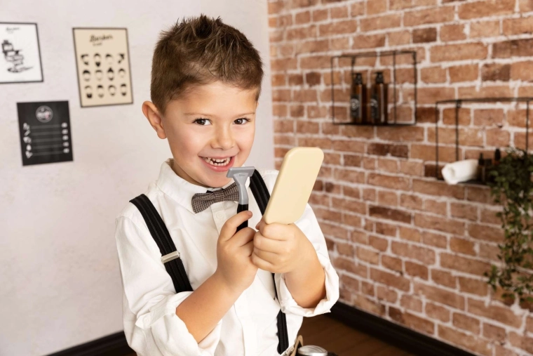 Espejo, tijeras, peine, cepillo, maquinilla de afeitar y otros accesorios ofrecen horas de diversión creativa y segura para niños a partir de 3 años.