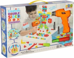 El set con tablero de mosaico permite a los niños, mediante el taladro de juguete, el destornillador y la llave, atornillar tornillos de colores y crear imágenes variadas y modelos tridimensionales. Da vida a la fantasía infantil: el único límite es la imaginación del pequeño constructor.