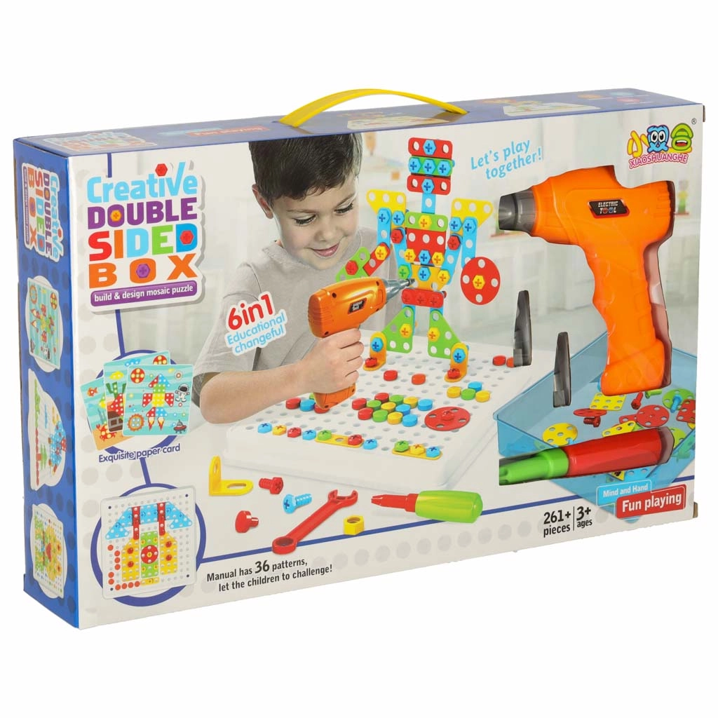 - Maletín, tablero de mosaico, piezas de construcción de diversas formas, tornillos de colores, taladro, llave, destornillador, libro con plantillas, cartas con imágenes
