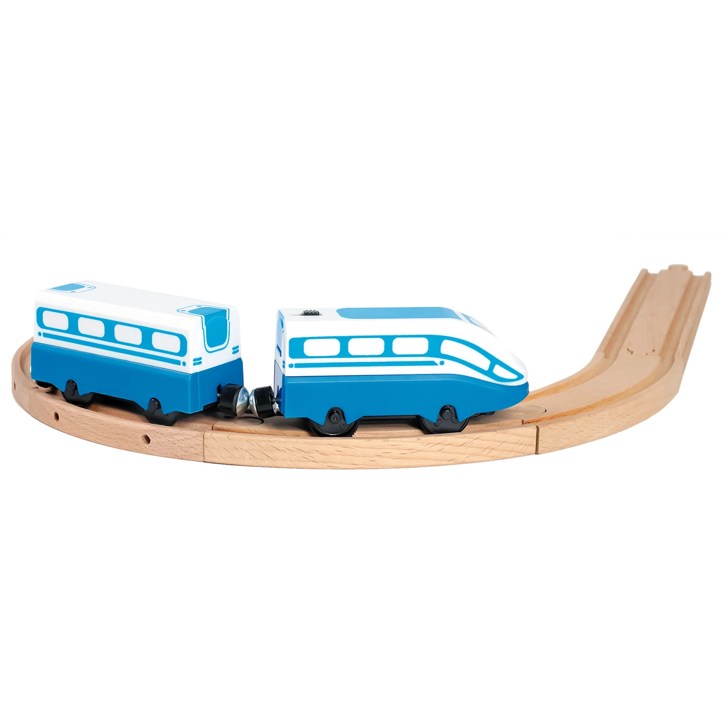 Esta locomotora eléctrica de alta velocidad con vagón es el complemento ideal para cualquier circuito de trenes de madera. Gracias a sus dimensiones compactas, manejo sencillo y acoplamiento magnético del vagón, proporcionará horas de diversión a los niños y, al mismo tiempo, desarrollará su motricidad fina e imaginación.
