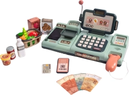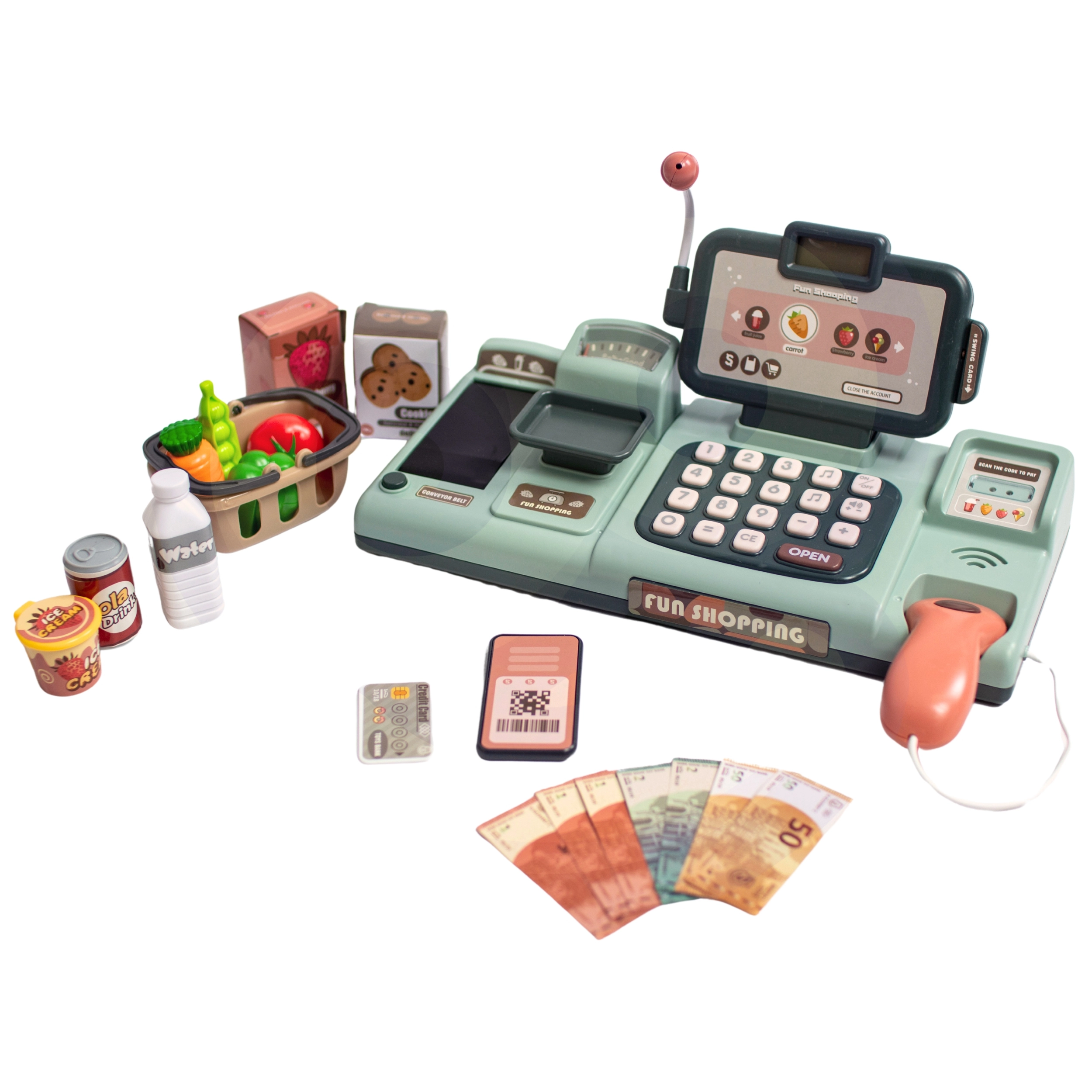 Incluye una caja registradora con balanza, terminal, calculadora, escáner y numerosos accesorios, como un smartphone de juguete y distintos tipos de alimentos de plástico.