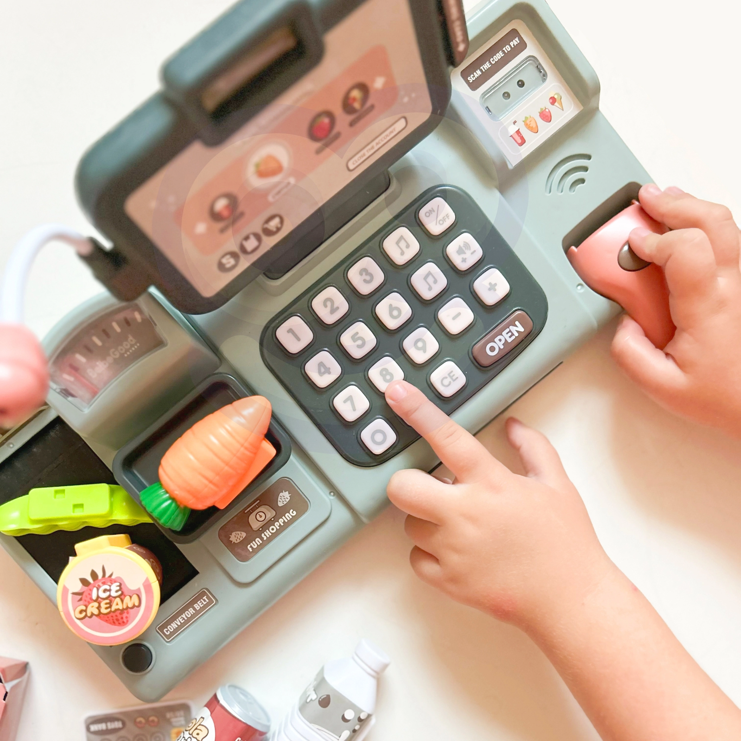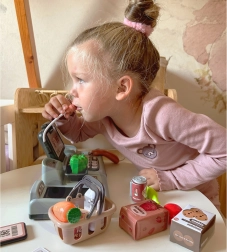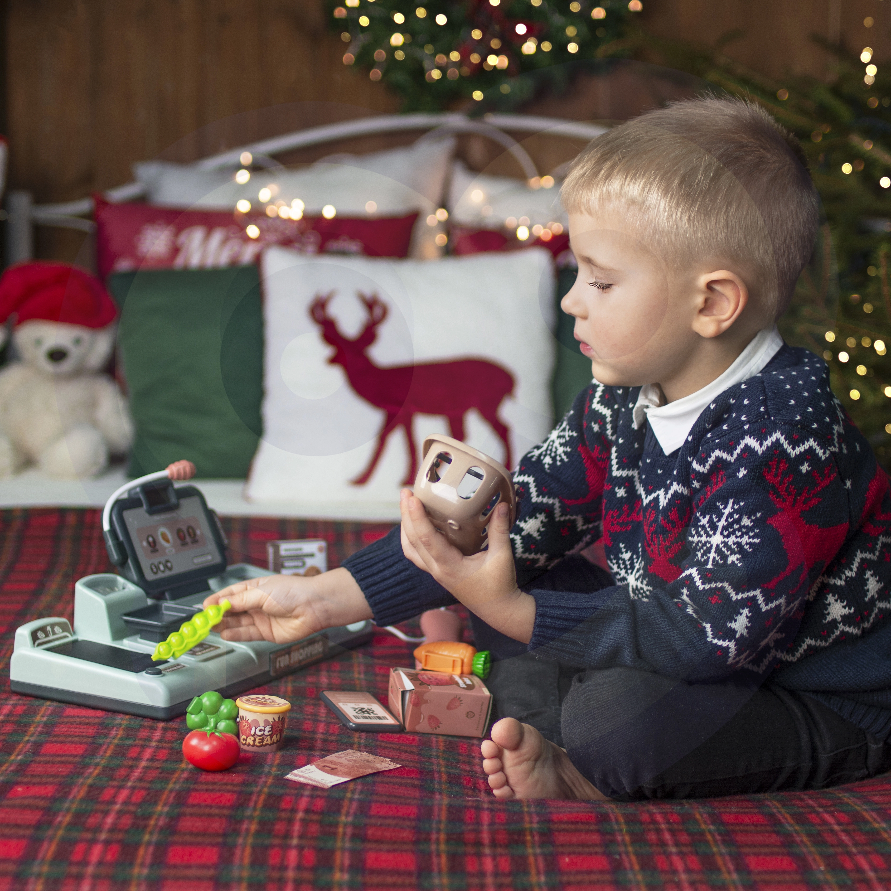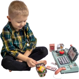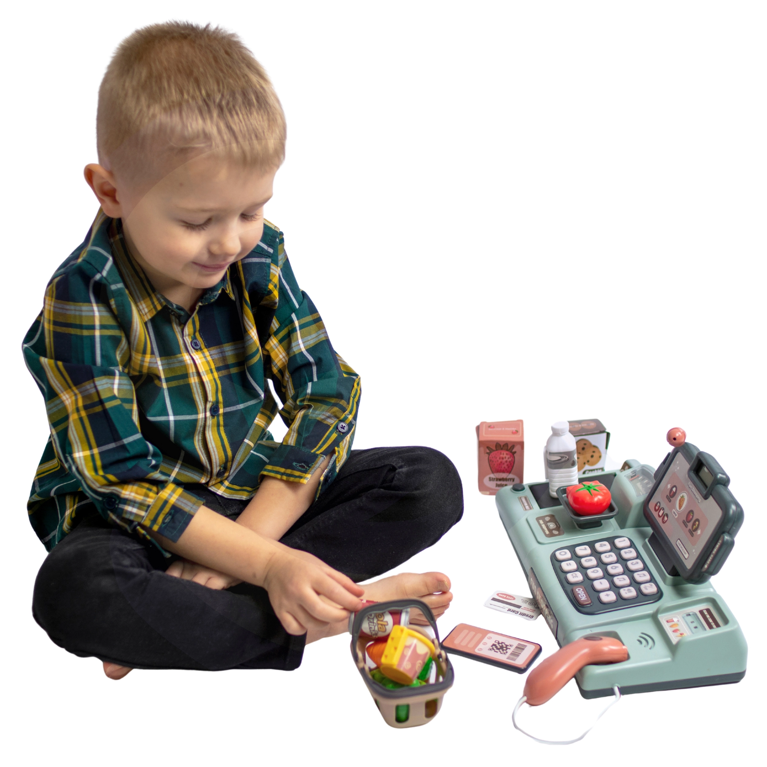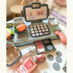 La caja incluye un terminal, gracias al cual el niño puede realizar pagos en efectivo, con tarjeta o con smartphone, igual que los adultos en la tienda. La balanza integrada y la cinta transportadora móvil permiten al niño organizar las compras y vivir el papel real de vendedor.