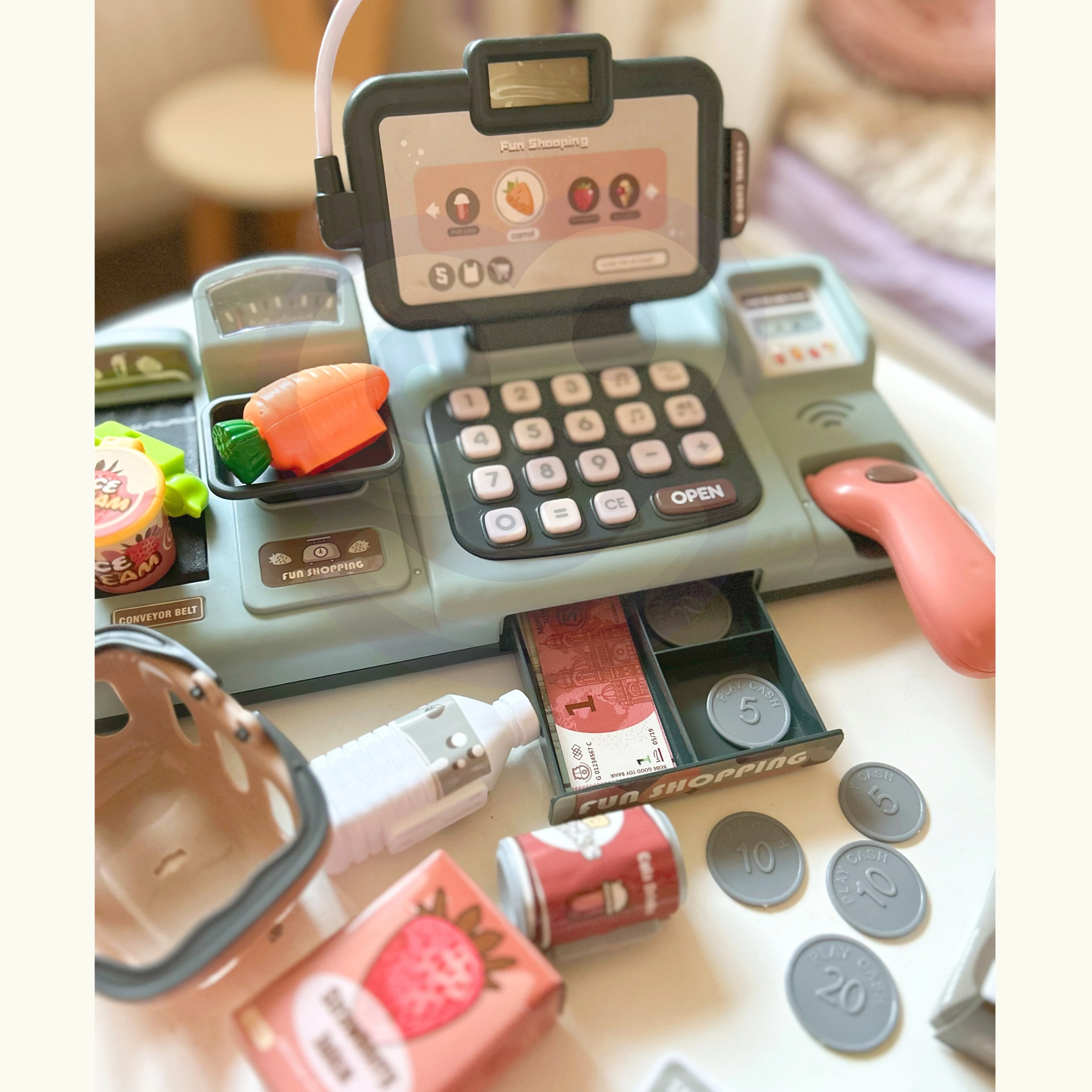 La caja registradora Woopie incluye una pantalla LCD realista y un lector de productos con sonido, lo que añade autenticidad al juego de la tienda.