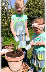 El set incluye guantes que protegen las manos de los niños y un delantal que evita manchar la ropa durante la jardinería y las manualidades.