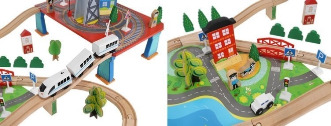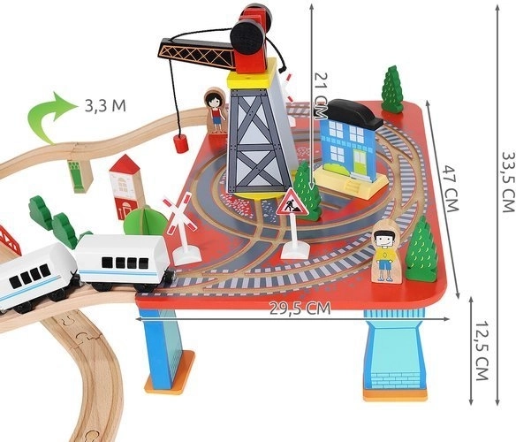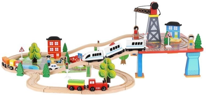Vía de tren de madera con un total de 88 elementos fabricados con precisión, incluyendo vías, tren de carga y tren de pasajeros, coche, arbolitos y señales de tráfico. La diversión reside en la posibilidad de crear tu propia ruta, mientras que la unión magnética de las piezas garantiza un manejo sencillo.