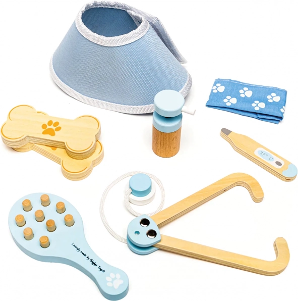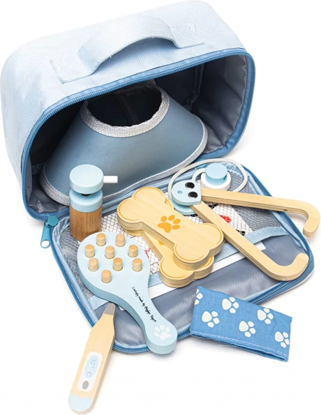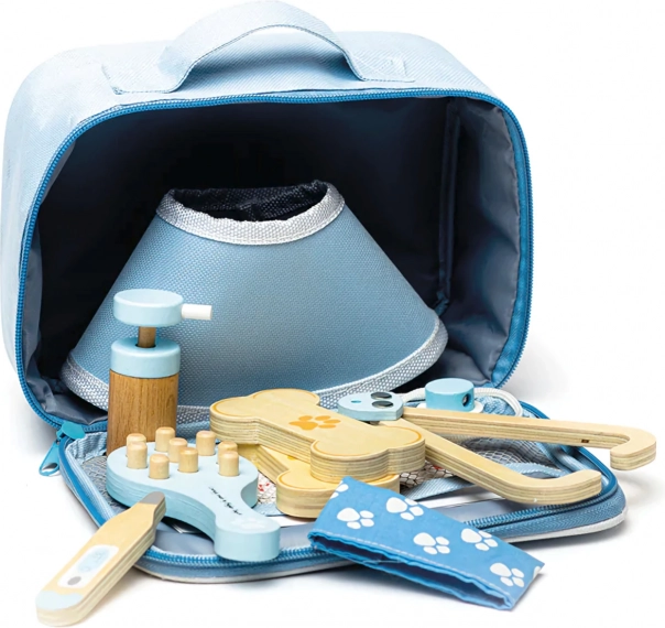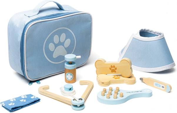 El maletín veterinario completo permite a los niños cuidar de peluches y figuras de mascotas como verdaderos doctores. El set incluye herramientas como estetoscopio, termómetro, otoscopio, jeringa, vendaje, cepillo, collar isabelino y otros accesorios. Todo está guardado en un resistente maletín textil con una huella de pata, ideal para transportar y almacenar.