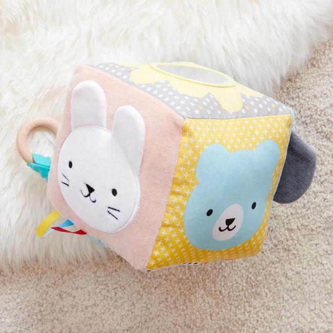 Este cubo textil está perfectamente diseñado para el desarrollo sensorial de tu bebé. Gracias a su variedad de actividades, como caritas de animales y distintos tejidos, es ideal para explorar cada pequeño detalle.