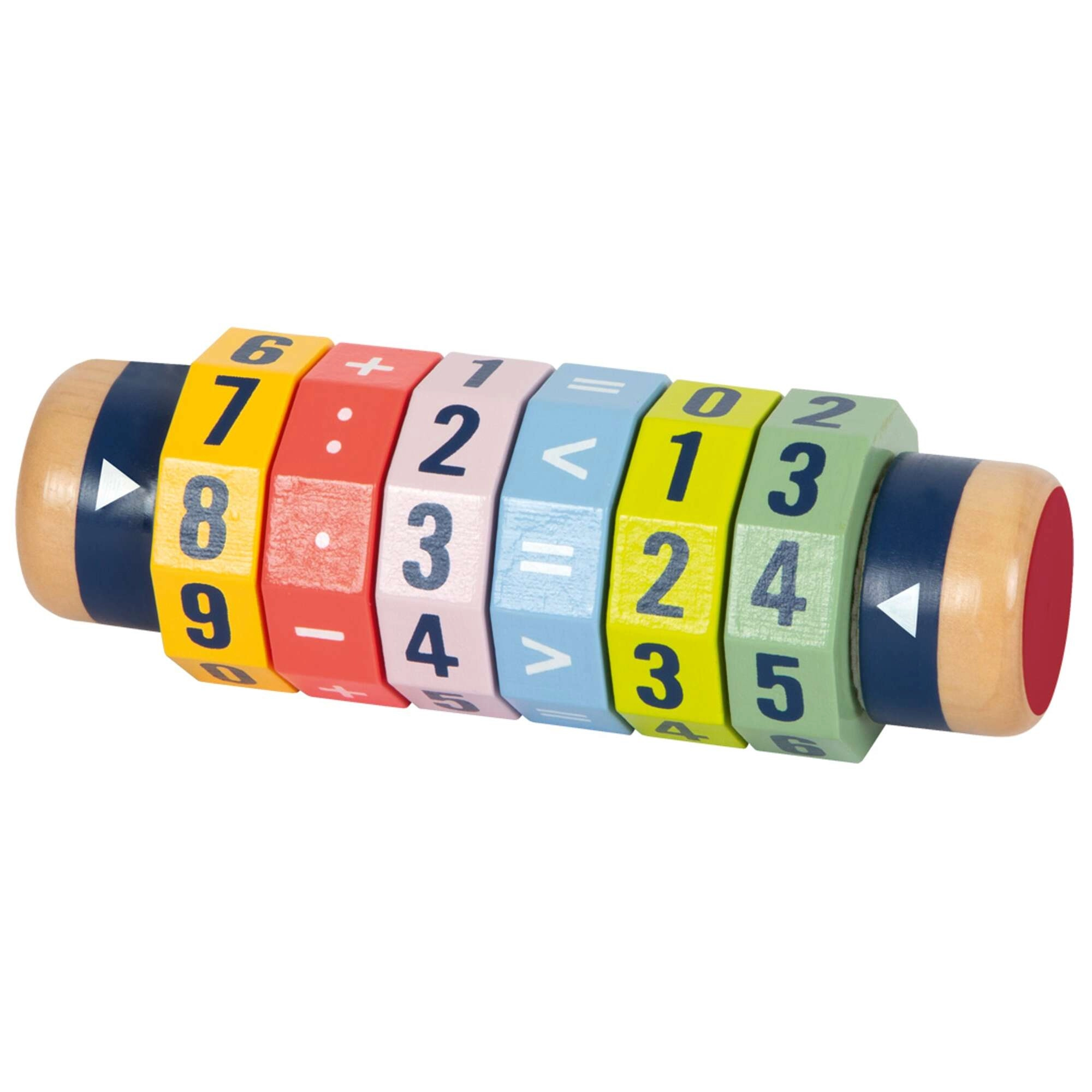 Descubre una forma divertida de aprender matemáticas. El cilindro de madera con seis anillos giratorios permite a los niños crear ecuaciones sencillas y más complejas, así como realizar comparaciones numéricas. Gracias a los colores vivos y a los números destacados, los niños aprenden de manera lúdica y refuerzan la motricidad fina y la concentración.