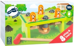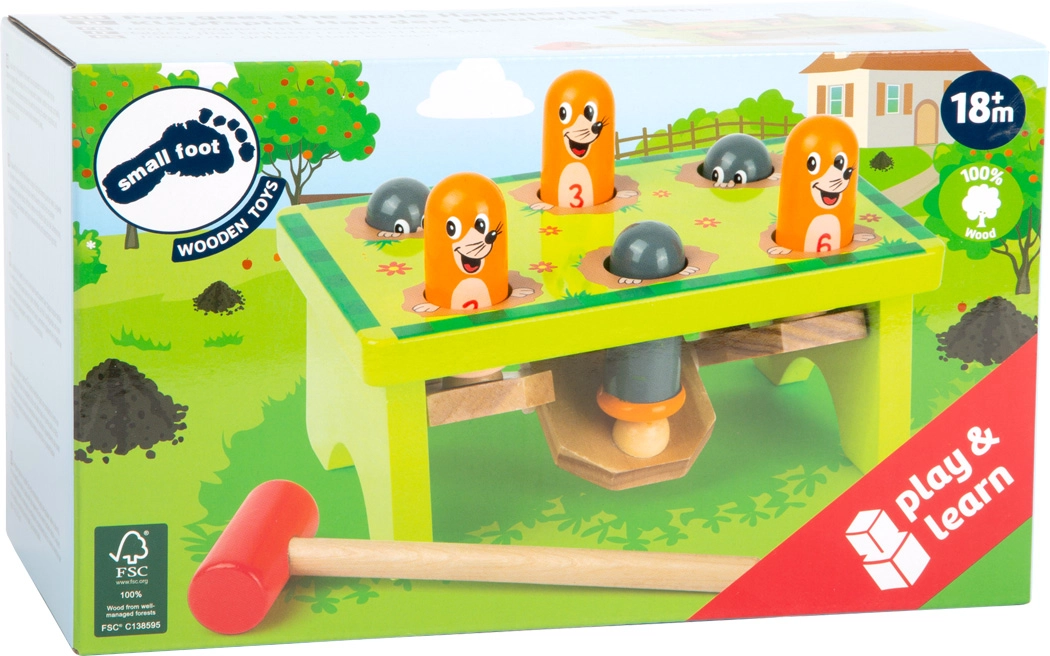 Una divertida banca de golpeteo de madera con el motivo de topitos trae alegría al juego y a la vez desarrolla habilidades. Con cada golpe del martillo aparece otro topo en un orificio distinto, lo que fomenta la coordinación ojo–mano, la motricidad fina y el reconocimiento de números gracias a las madrigueras numeradas. El juguete está hecho de madera 100% FSC con énfasis en la seguridad y la alta calidad de fabricación.