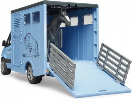 Este detallado transportador de caballos se basa en el popular vehículo comercial MERCEDES‑BENZ Sprinter. A los niños les encantará la cabina funcional con puertas que se abren, la carrocería tipo furgón realista para un transporte seguro y las amplias opciones de juego: desde la carga por la rampa hasta el tabique adaptado para dos caballos.