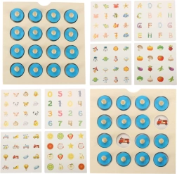 Juguete educativo de madera con clavijas extraíbles e imágenes con números. Ayuda a los niños a aprender los números y a desarrollar las habilidades motoras al emparejar las clavijas con las imágenes correspondientes.