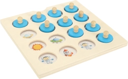 Tablero de madera con piezas de plástico decoradas con imágenes de astronautas, cohetes y planetas. Funciona como juguete educativo para desarrollar la memoria y las habilidades cognitivas.