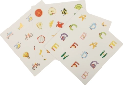 Conjunto de cartas educativas con letras del alfabeto en colores e ilustraciones correspondientes. Ayuda a enseñar y reconocer el abecedario de forma divertida e interactiva.
