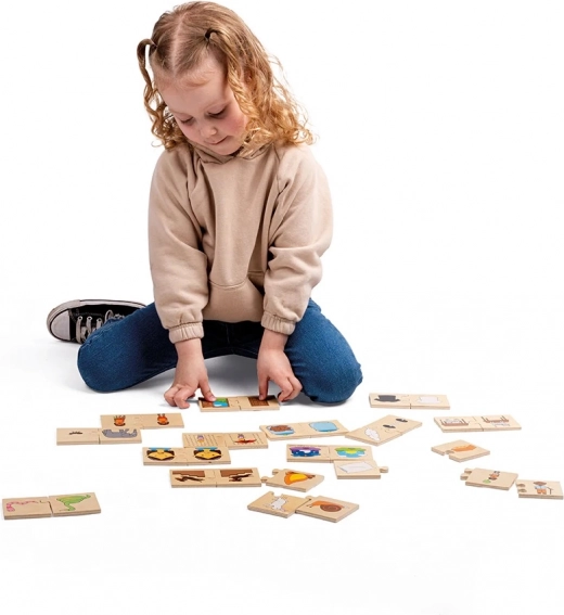 Los niños unen imágenes que se corresponden como significados opuestos, por ejemplo, día y noche, caliente y frío, triste y alegre. Las piezas lisas y robustas se sujetan y encajan fácilmente, de modo que las manitas pueden concentrarse en descubrir nuevas palabras y relaciones.