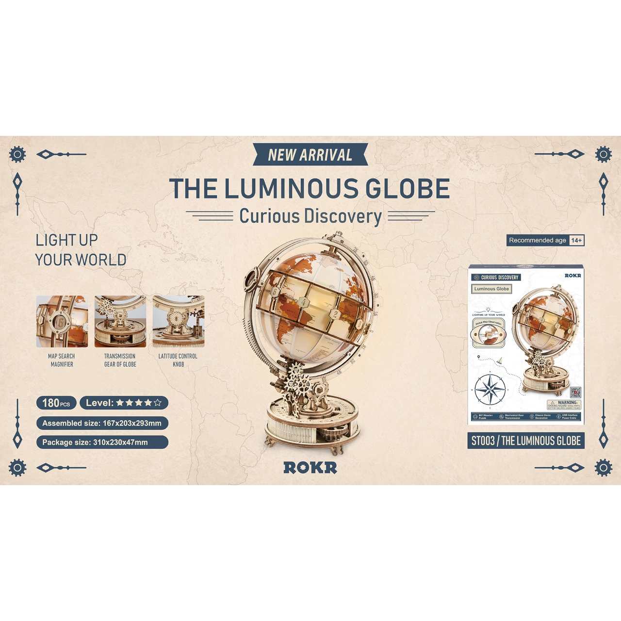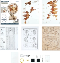 Descubre la magia del mundo con un modelo decorativo y funcional: un globo terráqueo de madera con iluminación LED que montarás tú mismo. Gracias al sistema de engranajes, el globo gira suavemente; incluye una lupa mecánica para leer detalles y una iluminación LED de bajo consumo alimentada por microUSB/USB-A. El kit, fabricado en contrachapado de alta calidad, ofrece una alta dificultad, pone a prueba la paciencia y la concentración, y tras el montaje se convierte en una elegante lámpara de noche de estilo retro.