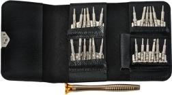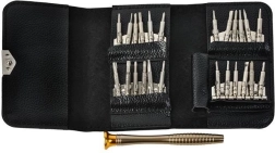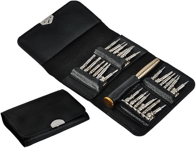 El juego de destornilladores de precisión 25 en 1 incluye un total de 24 puntas intercambiables y un mango base. Es ideal para el mantenimiento y reparación de la mayoría de dispositivos electrónicos disponibles en el mercado.