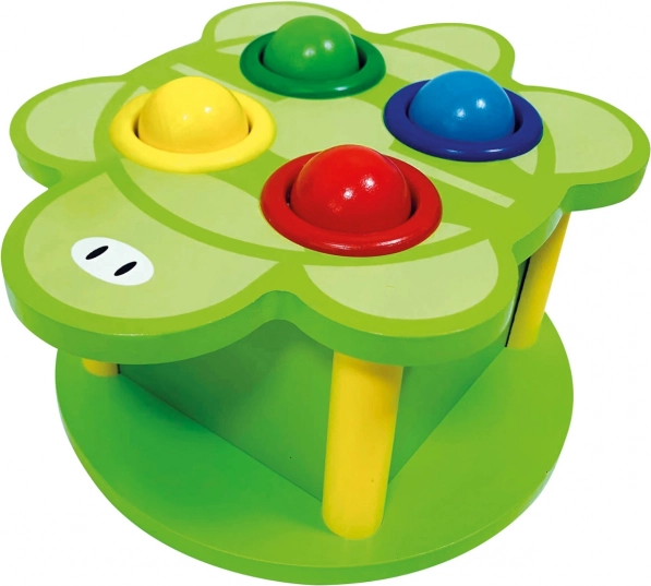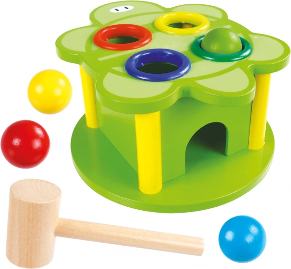 Golpear las pelotas con el martillo de madera favorece la motricidad fina, la coordinación mano‑ojo y la fuerza de agarre.
