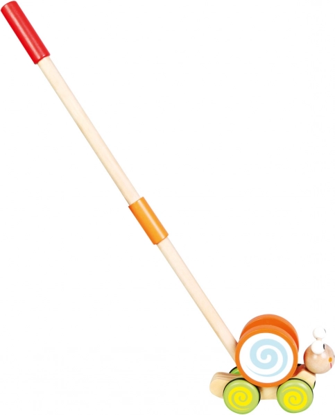 Un adorable correpasillos de madera con forma de caracol encantará a cada pequeño explorador. Gracias al palo largo, los niños pueden empujar el juguete cómodamente delante de ellos, lo que favorece sus primeros pasos, desarrolla la motricidad gruesa y fina y ayuda a aprender los colores y los animales. Las ruedas engomadas garantizan un deslizamiento silencioso y fluido tanto en casa como al aire libre.