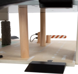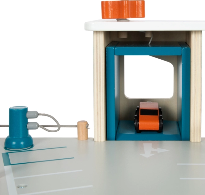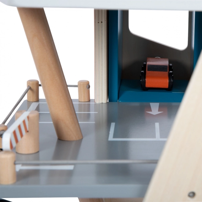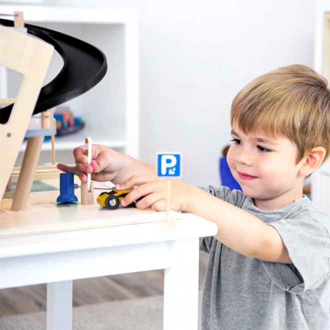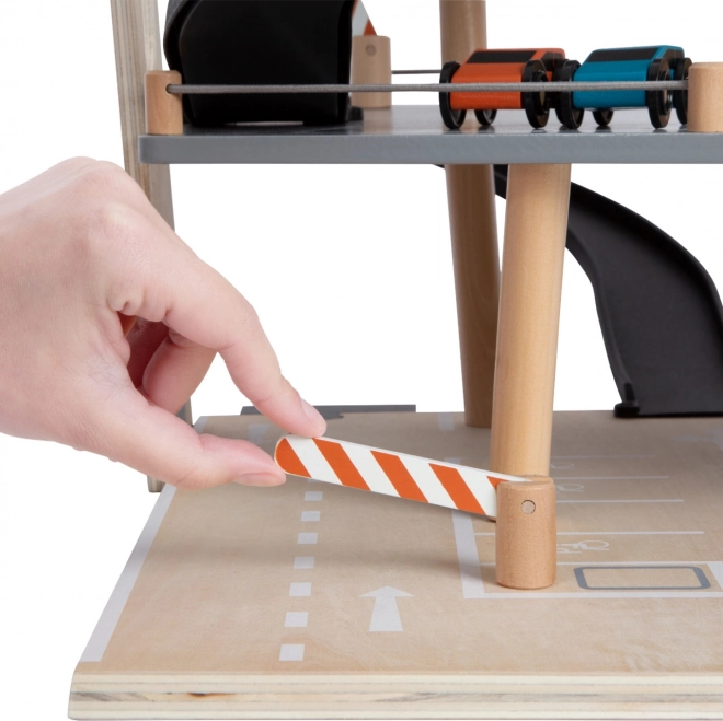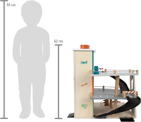Este aparcamiento de carreras de madera con diseño moderno ofrece a los niños un mundo de juego ricamente equipado. Los tres niveles están conectados por un ascensor funcional y dos rampas suaves que permiten un movimiento fluido de los cochecitos. Cada nivel cuenta con una barrera mecánica y un vallado de goma que aumentan la dinámica y evitan que los vehículos se salgan. Los iconos de colores y la señalización vial favorecen el aprendizaje a través del juego y desarrollan la imaginación.