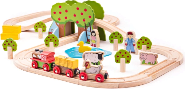 Este hermoso ferrocarril de madera con temática de granja de Bigjigs Rail incluye 45 piezas e incorpora figuras de personas, animales y árboles. Fomenta la imaginación y la coordinación, y está fabricado con materiales naturales obtenidos de forma responsable.