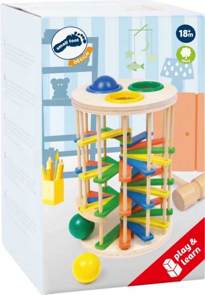 La torre de martillar con bolitas de Small Foot es el juguete perfecto para desarrollar las habilidades motoras de los niños. Consta de una torre en la que los pequeños martillean 3 bolas de colores a través de aros de plástico y observan cómo las bolas bajan por la escalera emitiendo un sonido de clic.